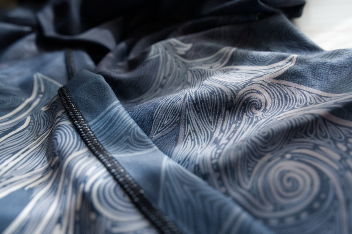 The fabric has a beautiful vibrant print with a sheen in the light. It has a lovely, comfortable fit and the fabric feels silky and smooth.