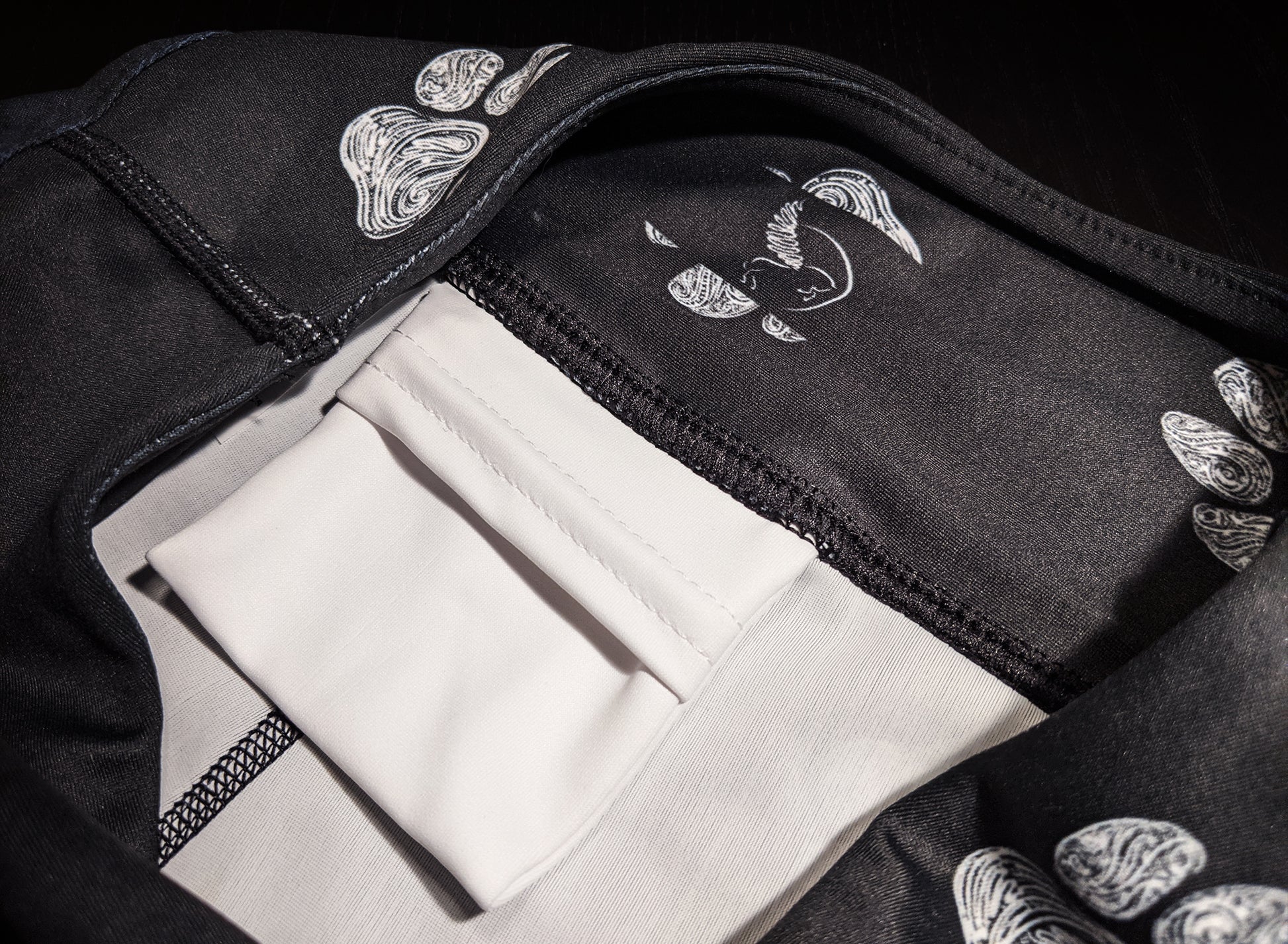 Darker legging designs will show white through when stretched. This is normal and is a result of the printing technique. If this bothers you, I would recommend a lighter overall design.