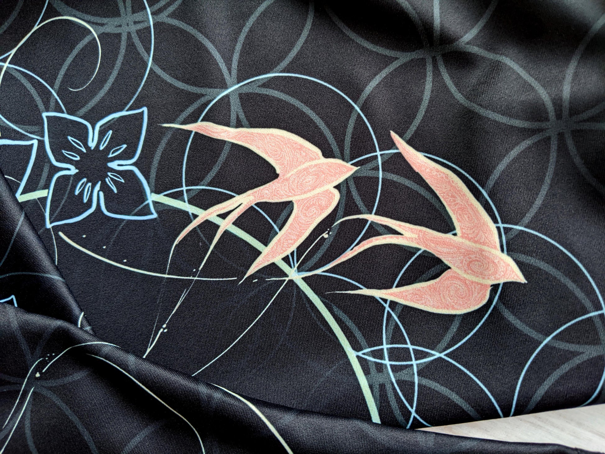 The fabric has a beautiful vibrant print with a sheen in the light. It has a lovely, comfortable fit and the fabric feels silky and smooth.